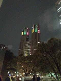 Caféが終わった後に呼ネット代表の小田さんが 「あれ、都庁がオリンピックカラーになってるんじゃなーい?」 と言うので、みんなで都庁を見上げたら、とっても綺麗な2020年の東京オリンピックカラーになっている事に気付きましたー‼ さすが小田さん、少しだけ上向きの角度の車椅子に乗っている小田さんだからこそ気付けた綺麗さですね。